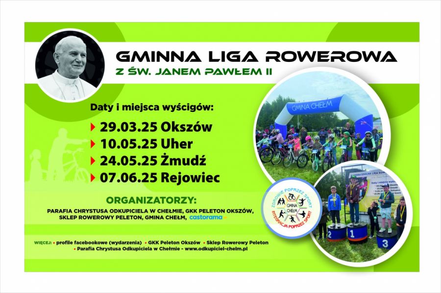 Rozpoczynamy sezon rowerowy. Z wielką radością więc ogłaszamy kolejną edycję, bo już VII naszej Gminnej Ligi Rowerowej ze Św. Janem Pawłem II. Jest to cykl czterech wyścigów dla przedszkolaków, dzieci i młodzieży, które odbędą się w: Okszowie, Uhrze, Żmudzi, Rejowcu. Zwiększamy ilość kategorii z myślą o naszych najmłodszych uczestnikach. Chcemy, żeby było ich jeszcze więcej. Zapisy przed każdym wyścigiem rozpoczną się 2 tygodnie przed zawodami. Będą prowadzone tylko i wyłącznie przez formularz internetowy.