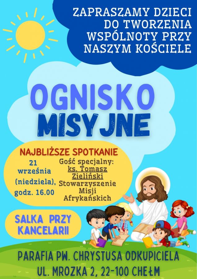 Wraz z rozpoczęciem roku szkolnego zaczynamy nowy rok formacji w naszym ognisku misyjnym. W najbliższą niedzielę o g. 16.00 zapraszamy dzieci na spotkanie naszej wspólnoty w której gościć będziemy misjonarza ks. Tomasza Zielińskiego ze Stowarzyszenia Misje Afrykańskie. Nasz gość będzie opowiadał o swojej posłudze w Tanzanii.