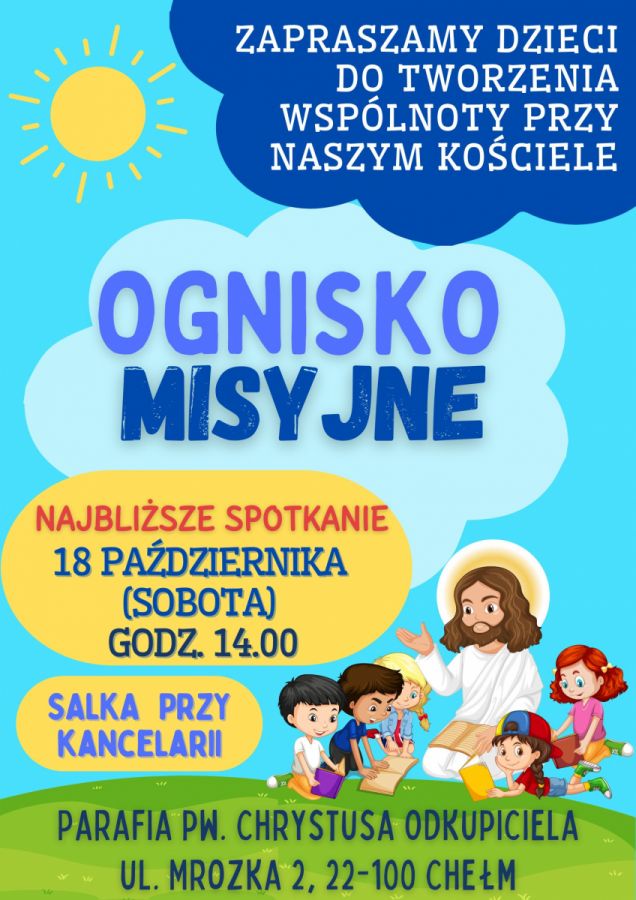 Nasze ognisko misyjne gromadzi dzieci na comiesięcznych spotkaniach, które mają rozpalić wśród nich ducha misyjnego. Na najbliższym spotkaniu w sobotę (18 października) o g. 14.00 będziemy przygotowywać się do Światowego Dnia Misyjnego, który przypada następnego dnia. W naszej parafii chcemy w niedzielę 19 października podczas Mszy Św. o g. 11.30 nieść dary w procesji. Już teraz przygotowujemy się do tego wydarzenia przez dobór właściwych strojów i darów pochądzących z różnych kontynentów.